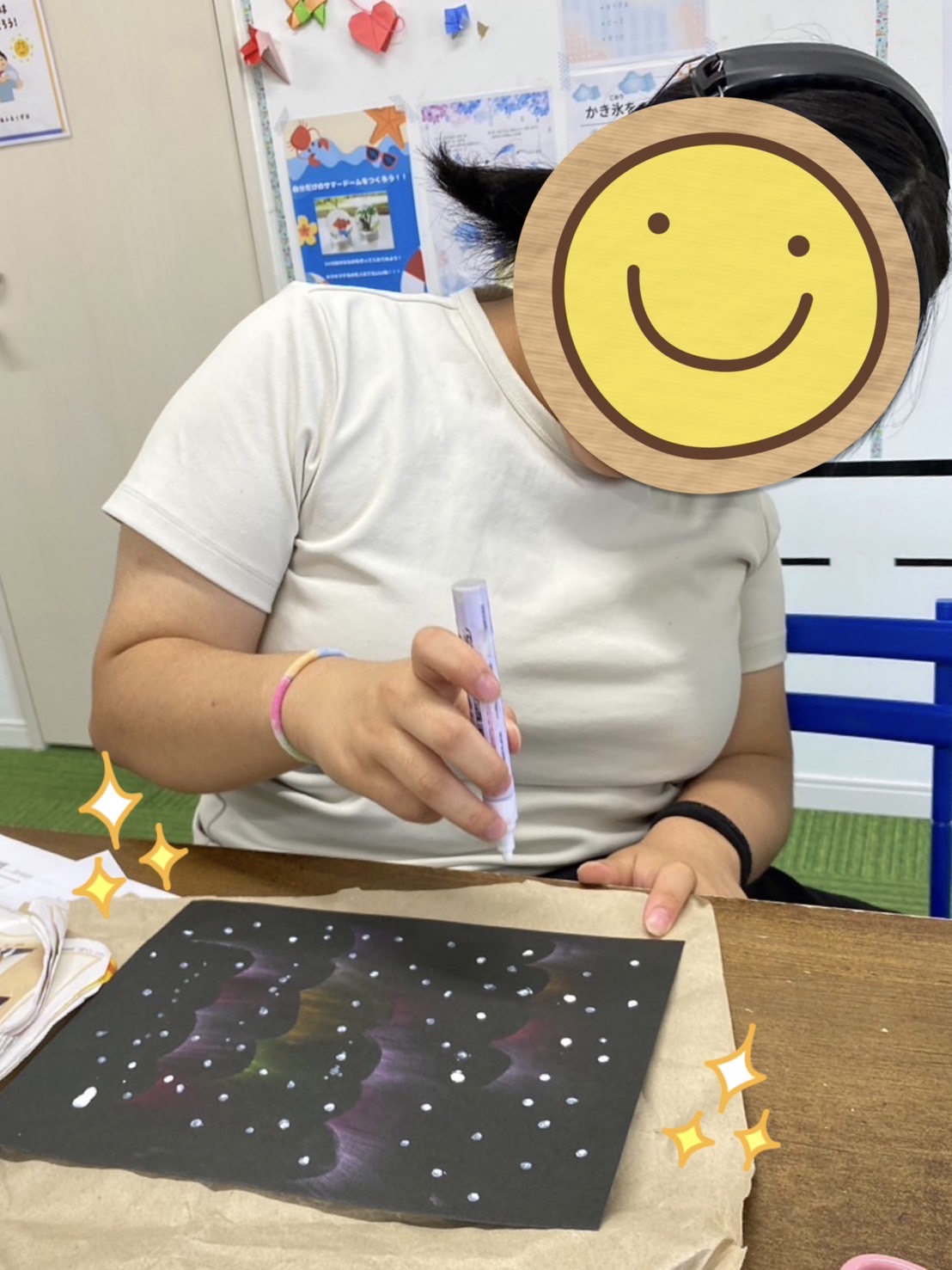 ぼかし絵でオーロラが完成した後は、白いマジックペンで星をイメージした点を描くことで、綺麗な夜空を表現した作品に仕上がりました!