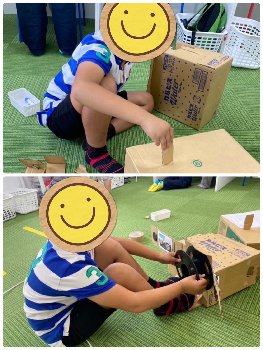 ハサミやテープを使って組み立てたり、マジックで絵を描いたりしていましたよ!