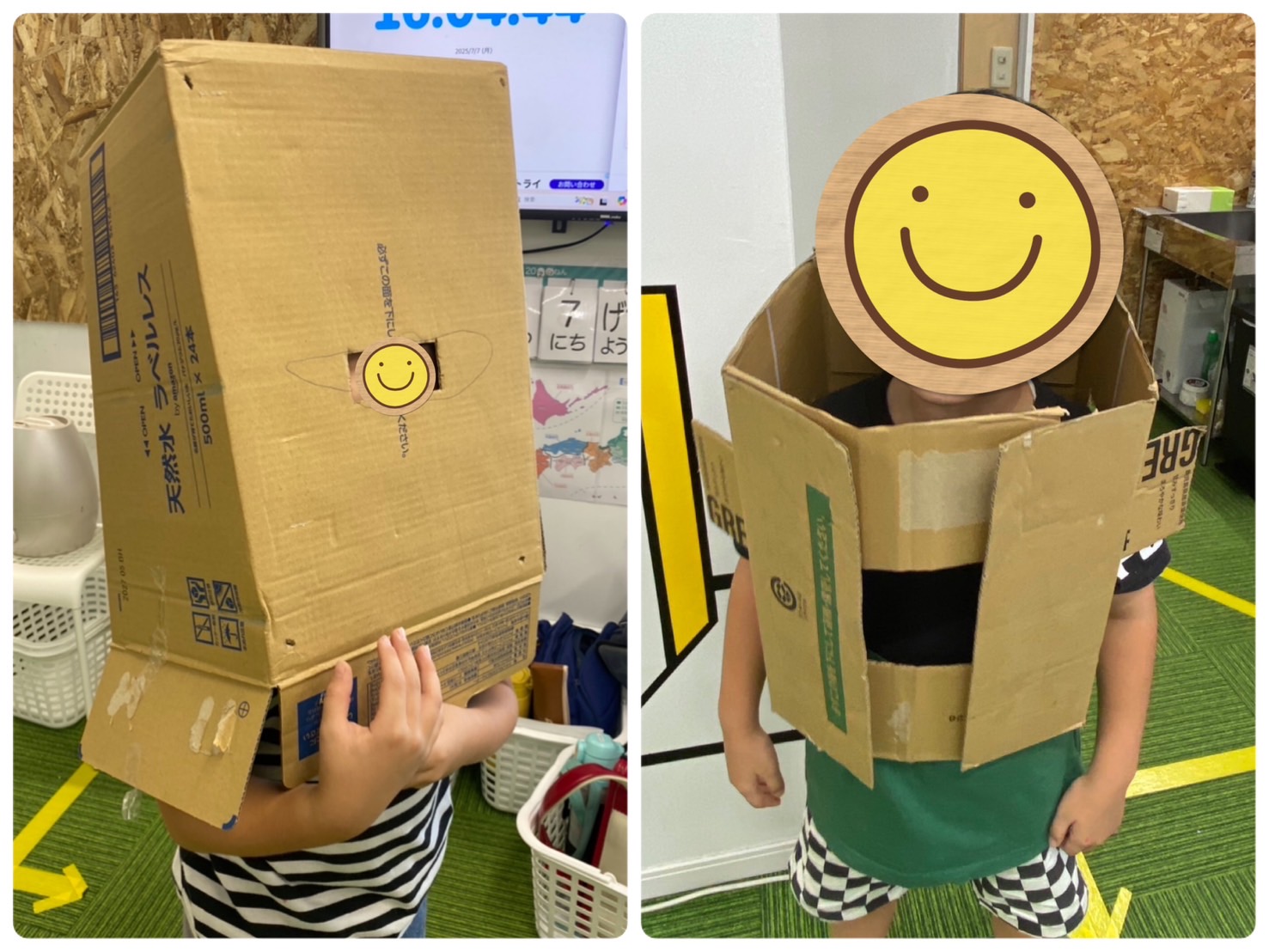 指導員に手伝ってもらいながらダンボールに穴を開けて被ることができるようにしており、嬉しそうに室内を歩いていました!