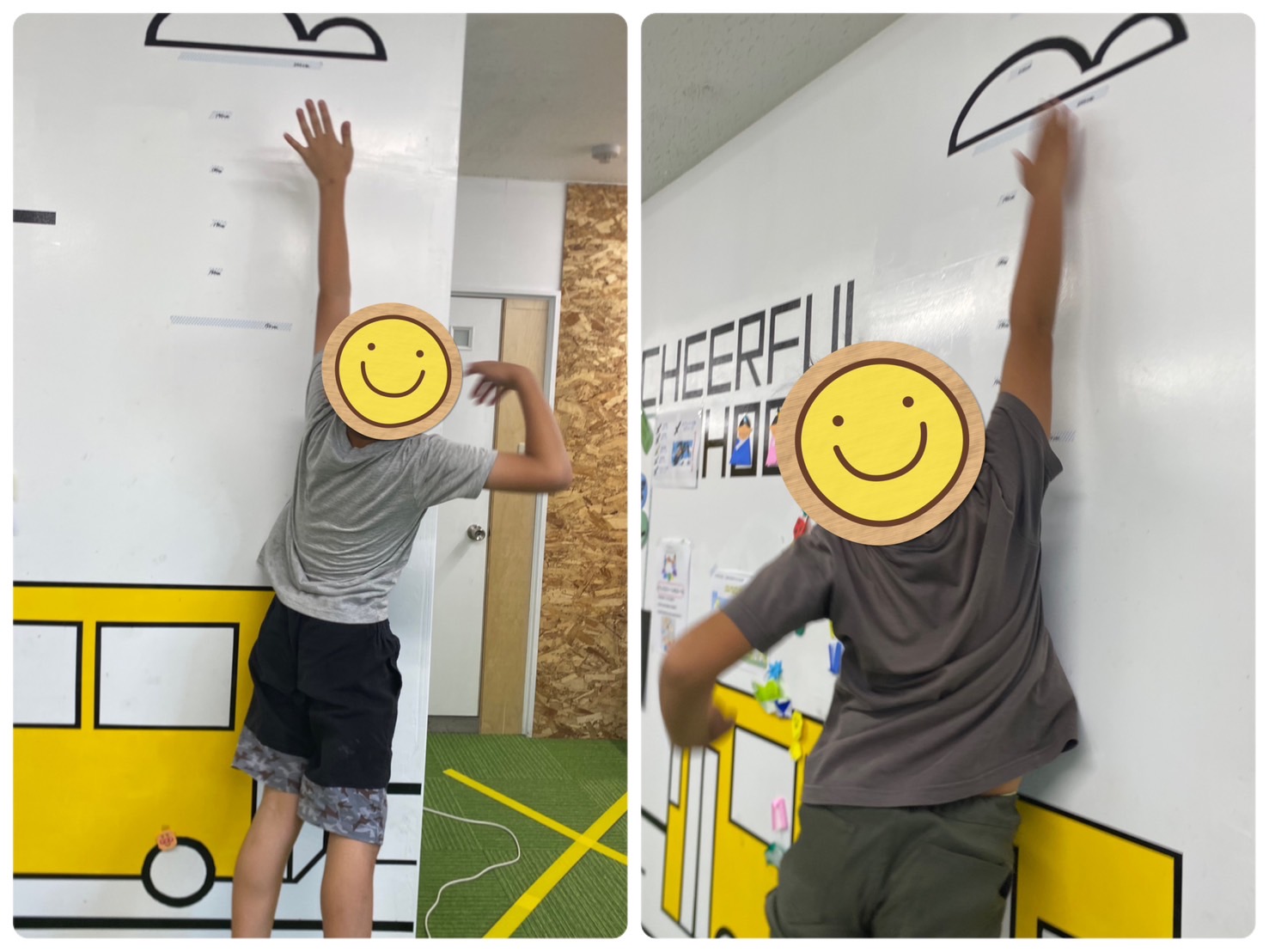 実際にその場でジャンプして壁にタッチしているお子さんがいたので、どの程度跳ぶことができているのか、高さが分かるようにテープで目印をつけてみました!