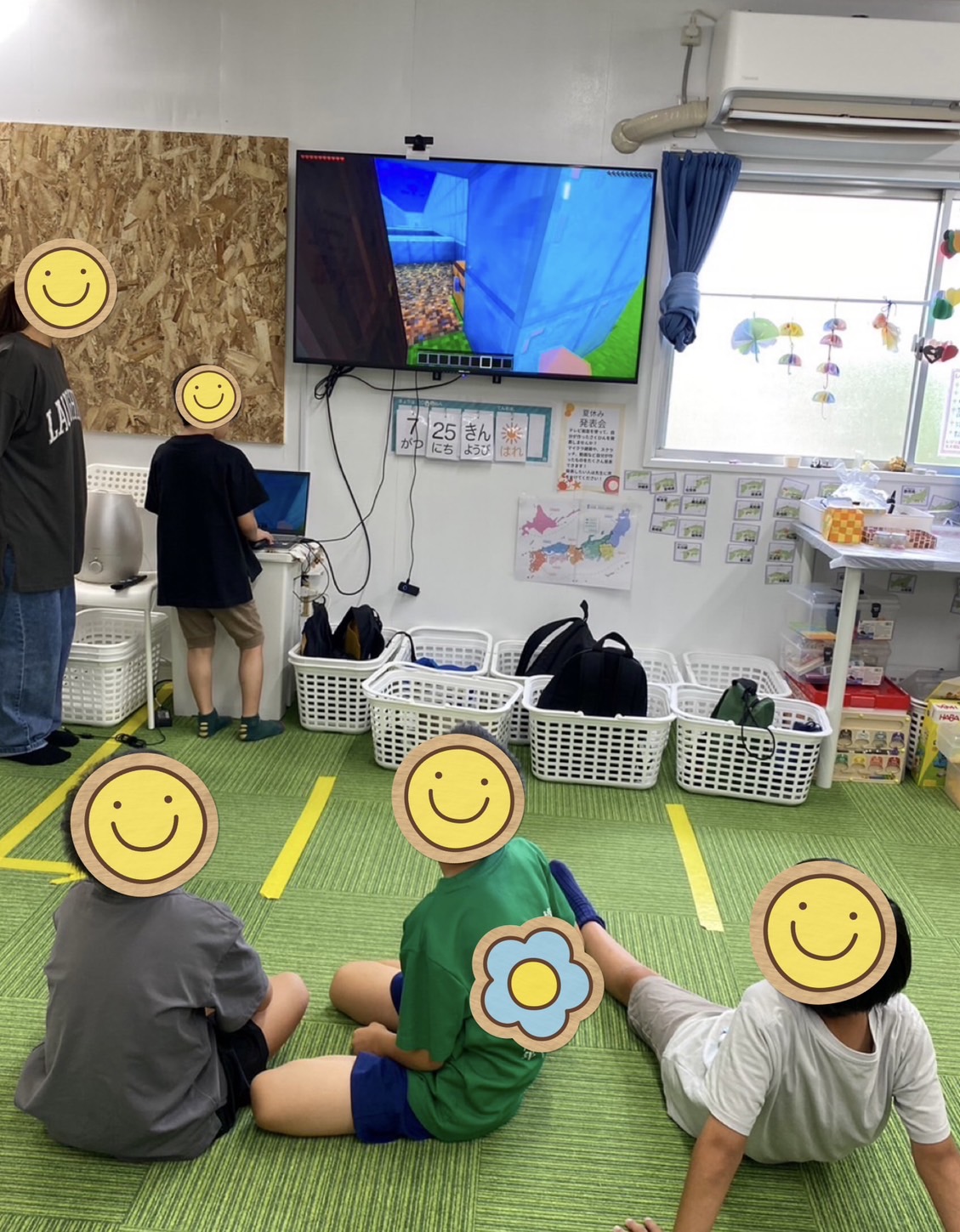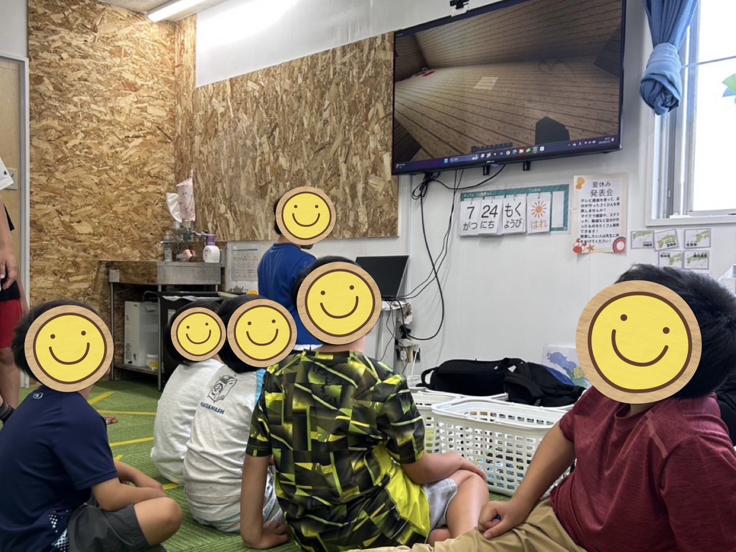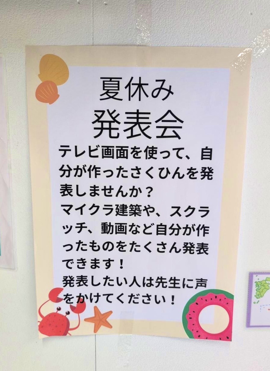 夏休み中、マイクラ建築やスクラッチ、動画など、お子さんが自分で作成したものをテレビ画面で発表する機会を設けています!